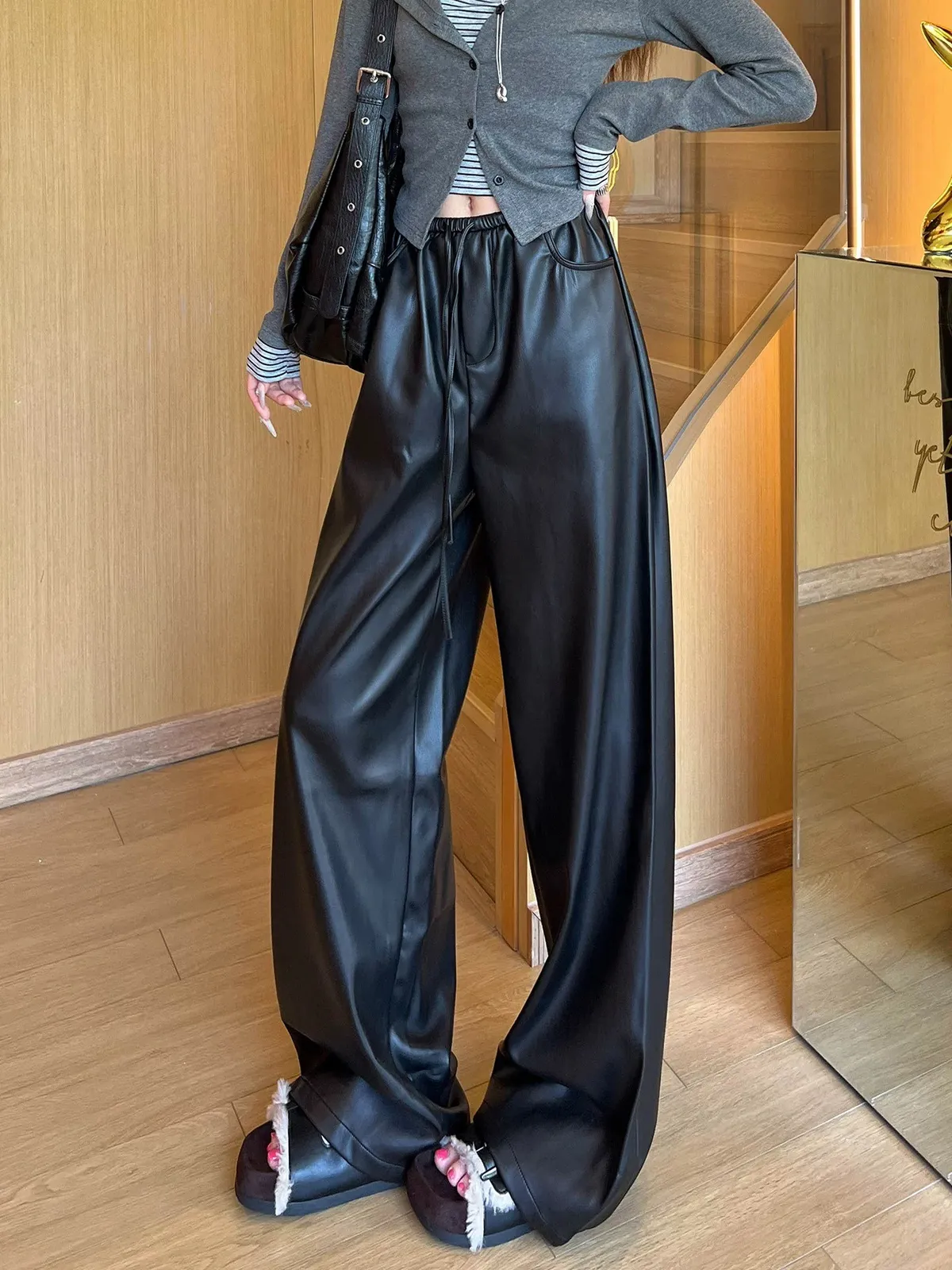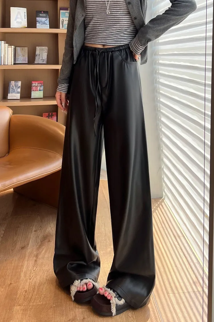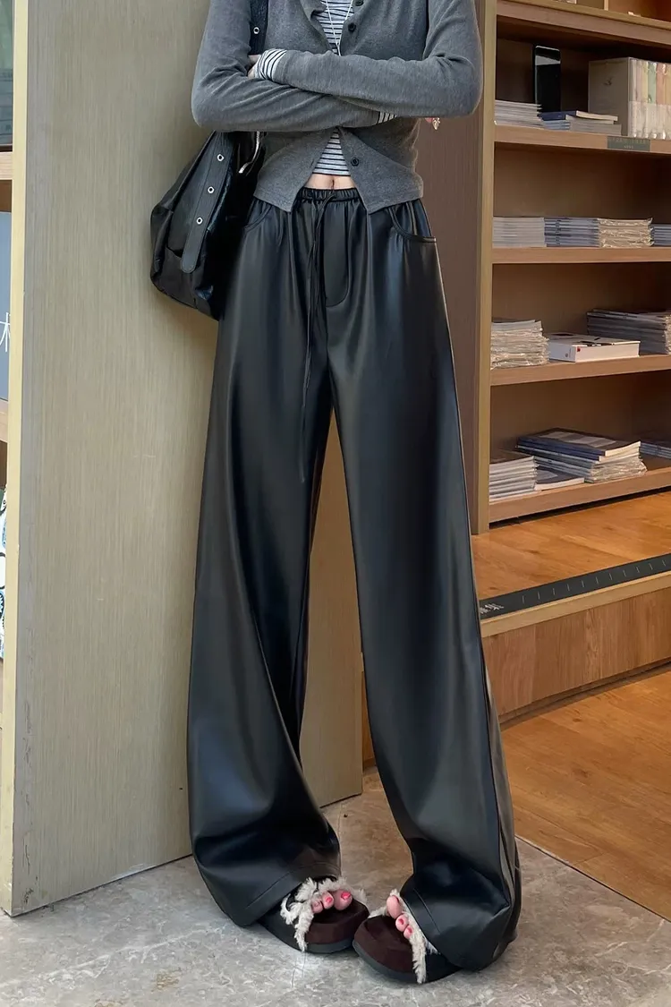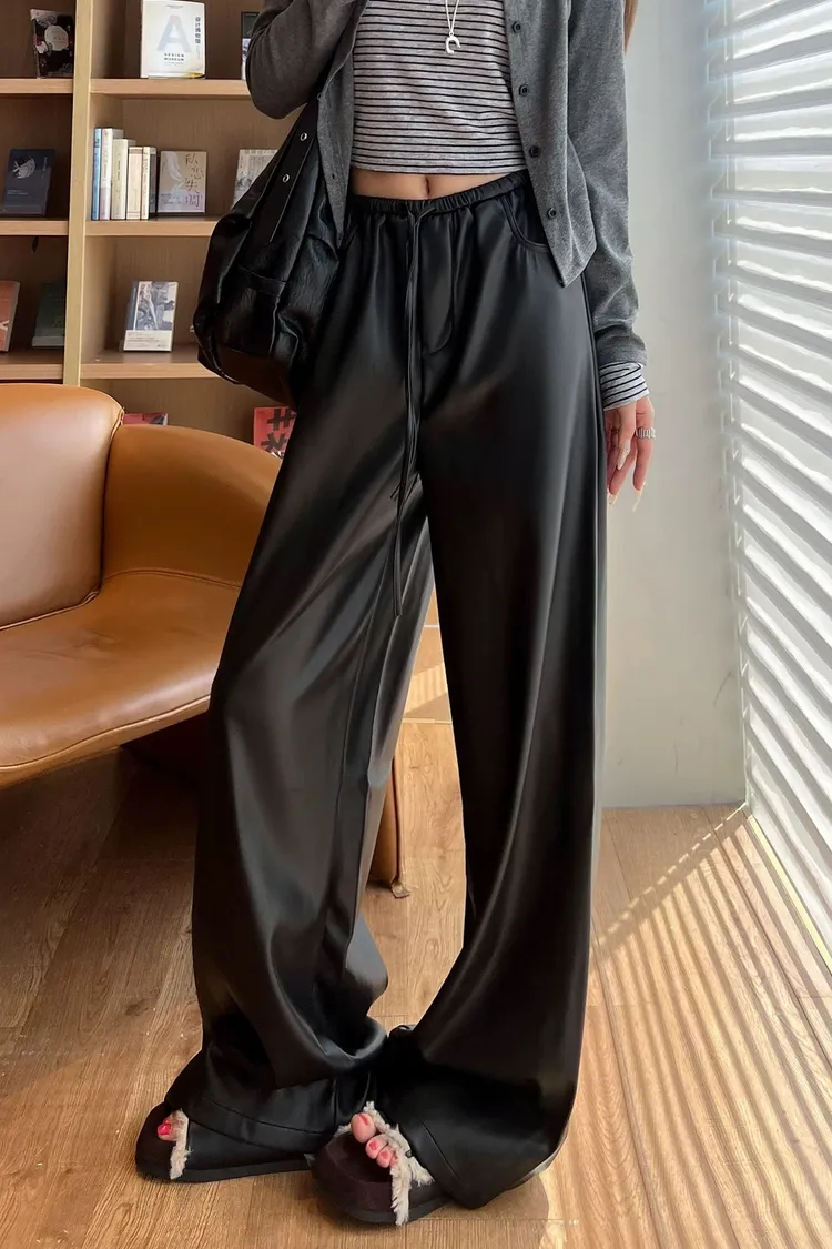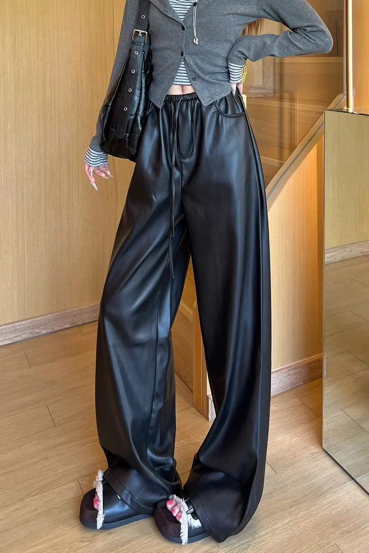 皮革鬆弛闊腿褲