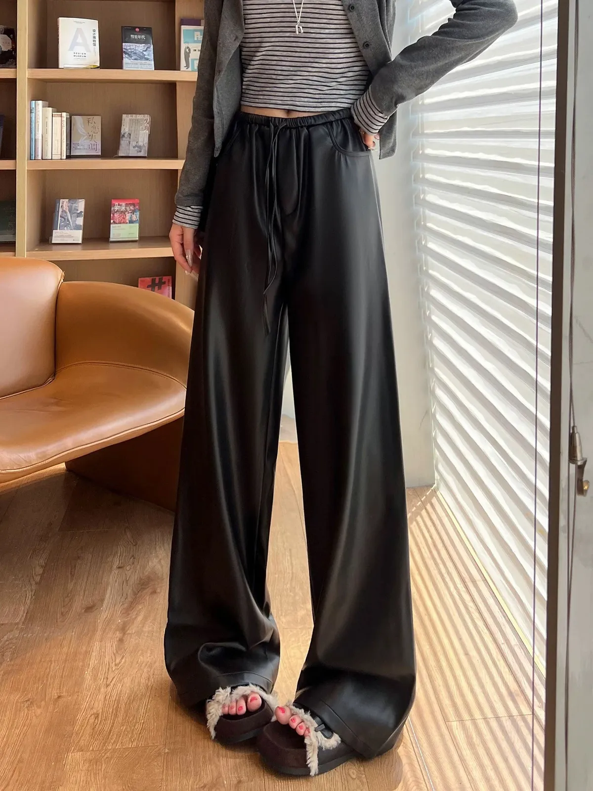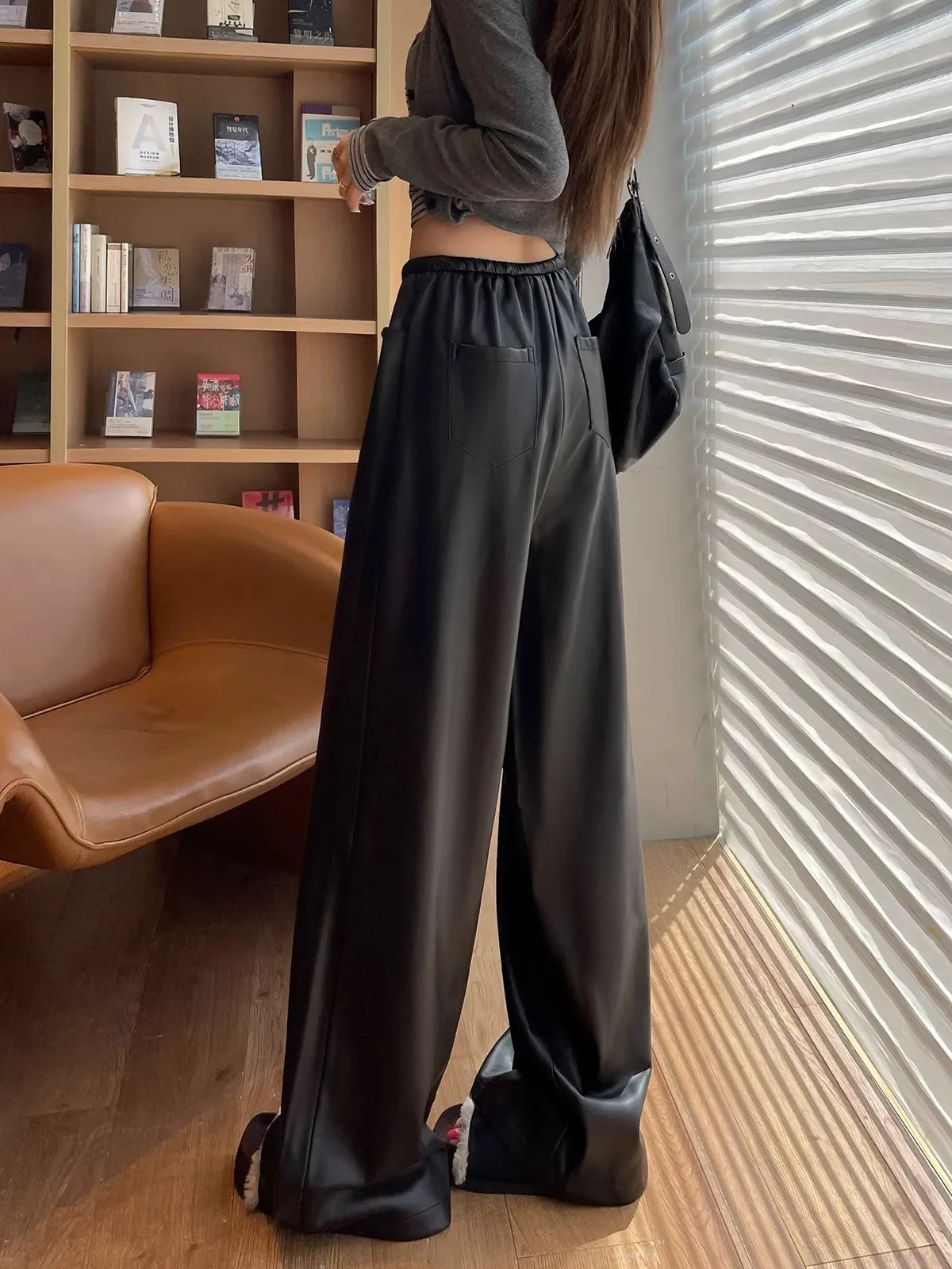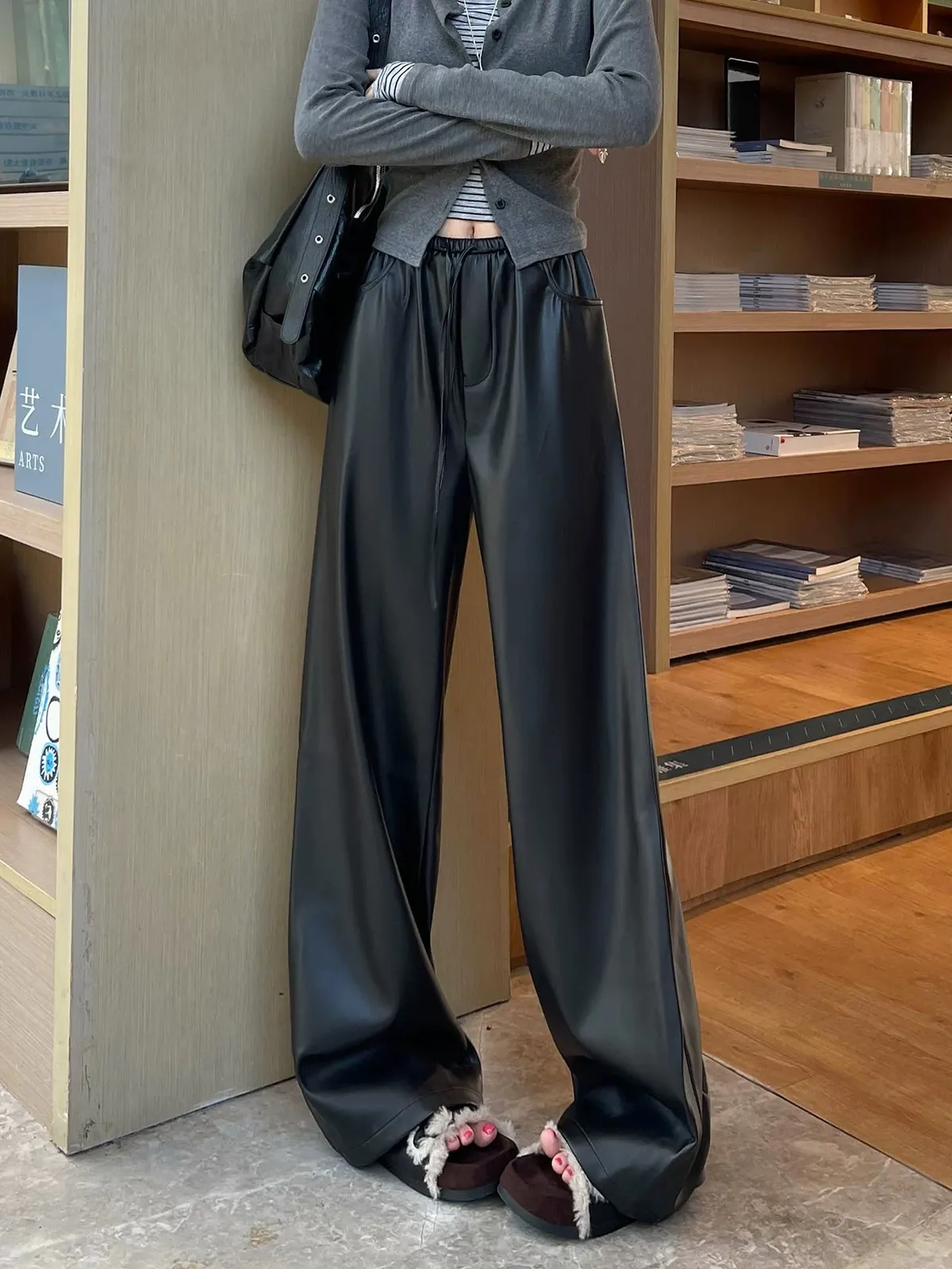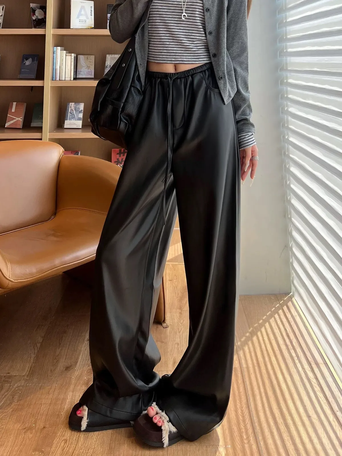 皮革鬆弛闊腿褲