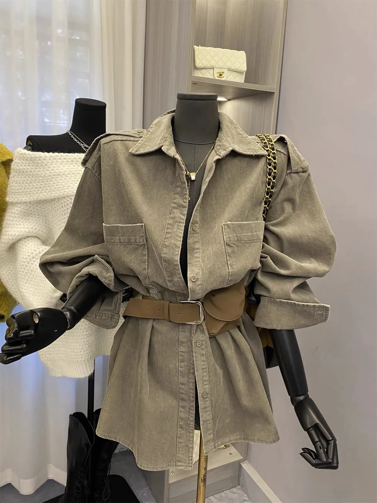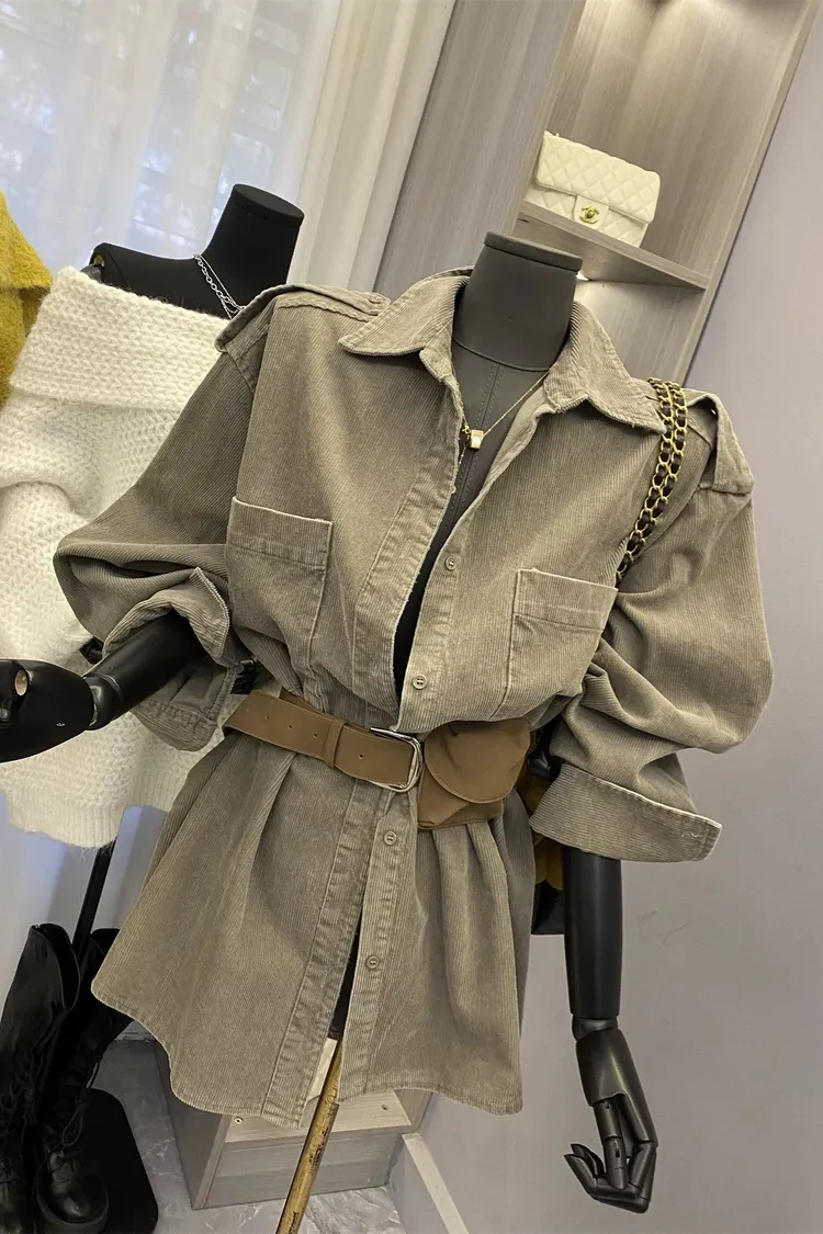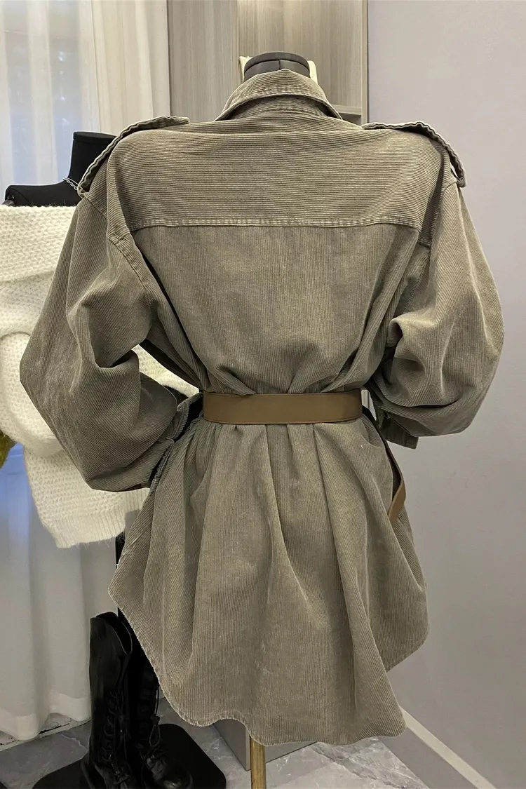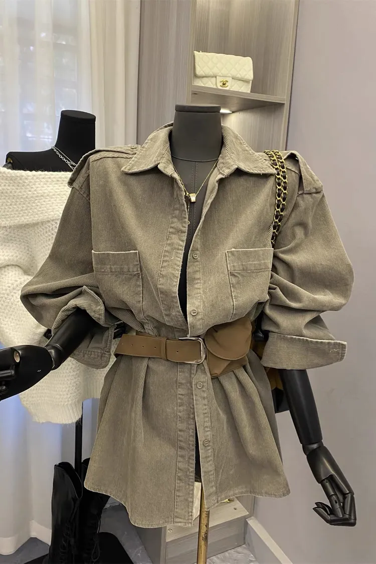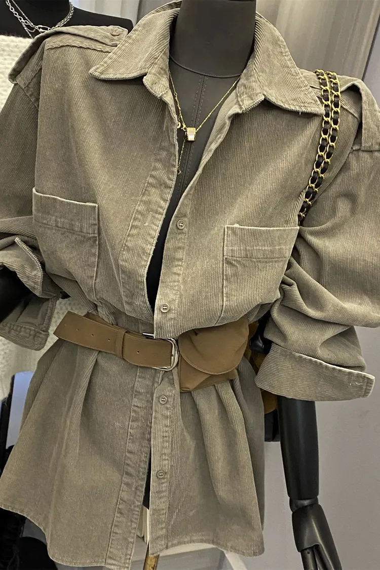 燈芯絨雙口袋襯衫+腰帶