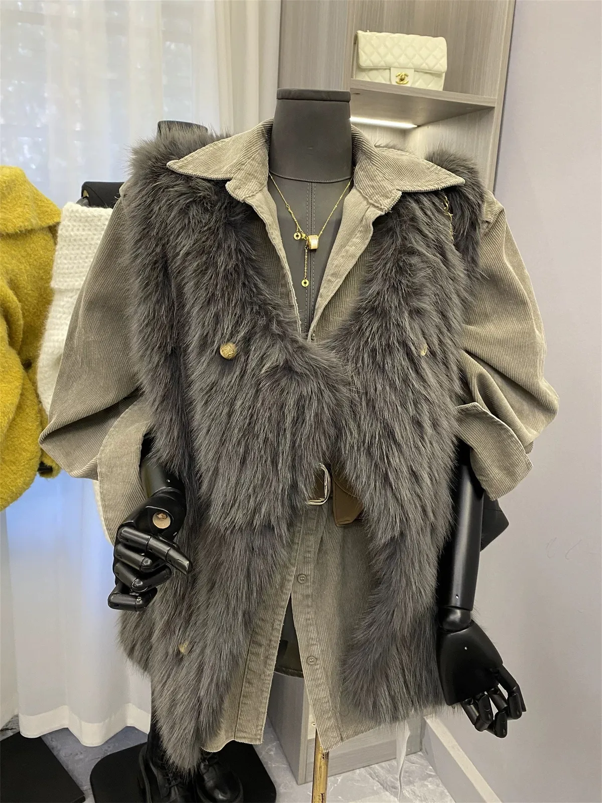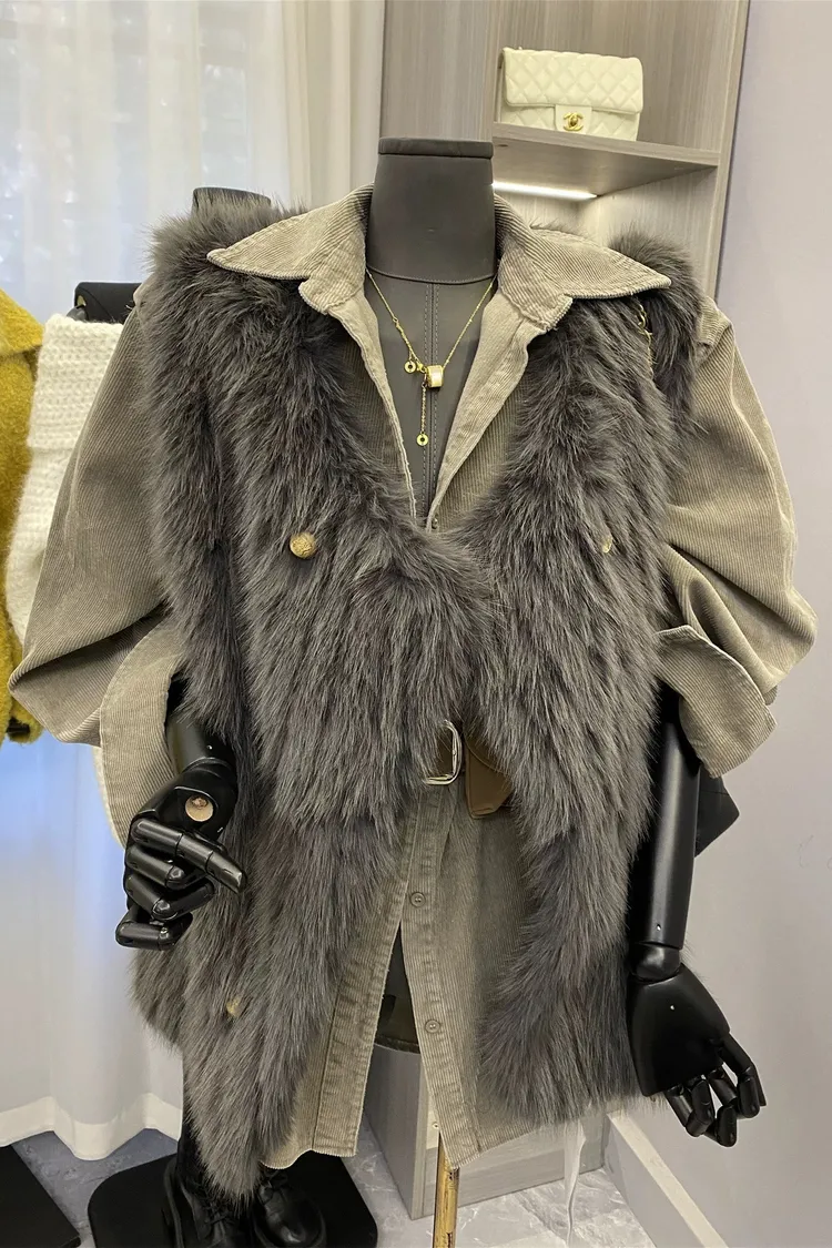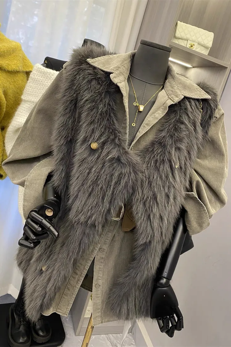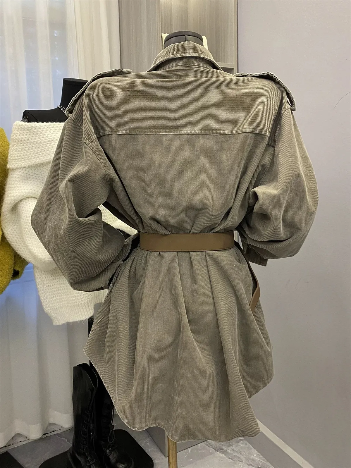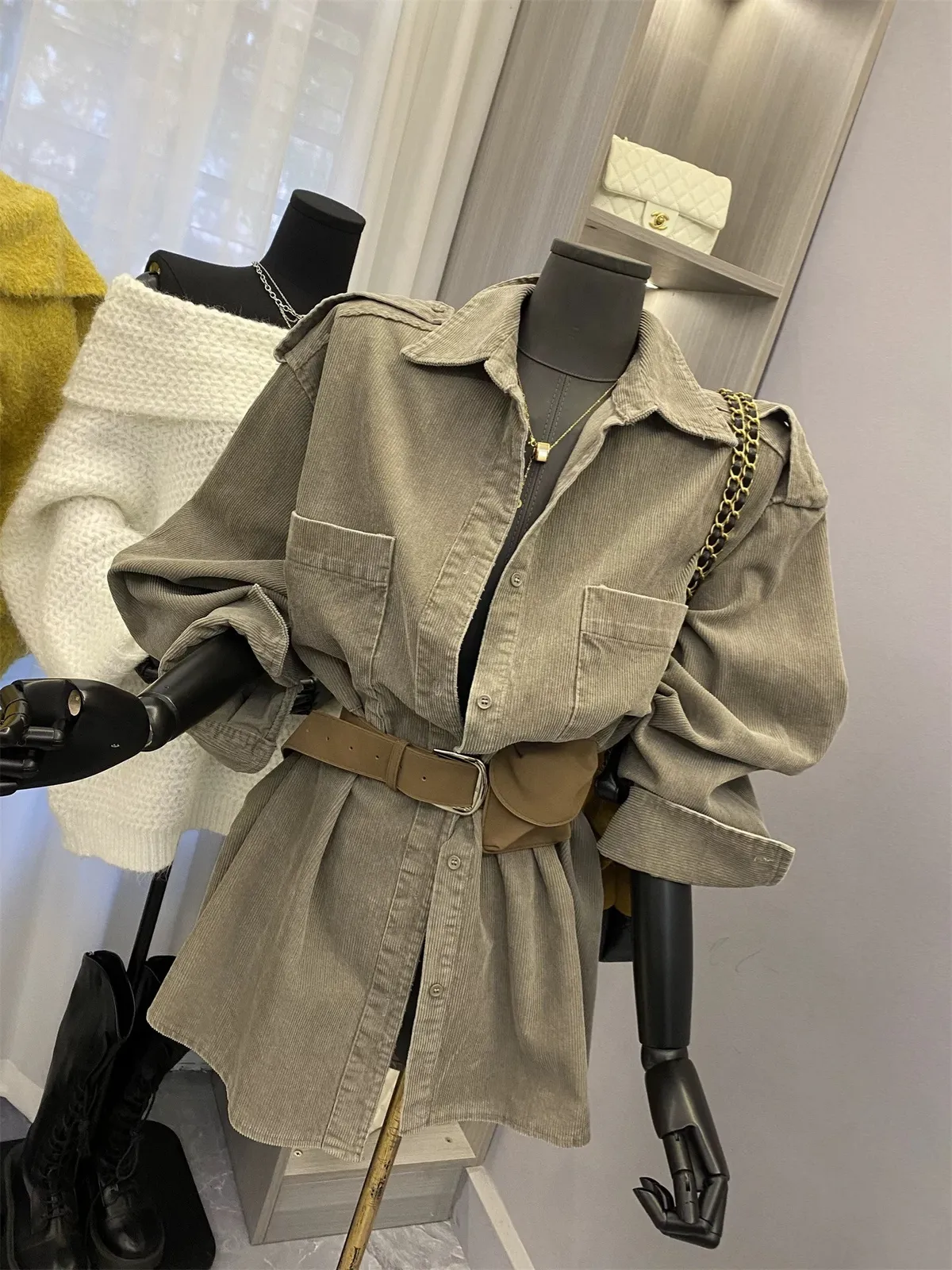 燈芯絨雙口袋襯衫+腰帶