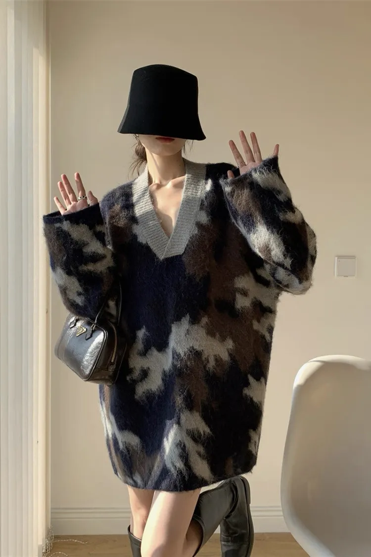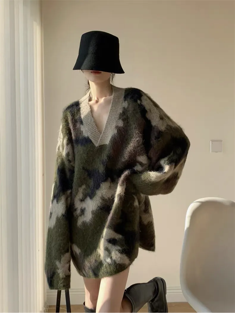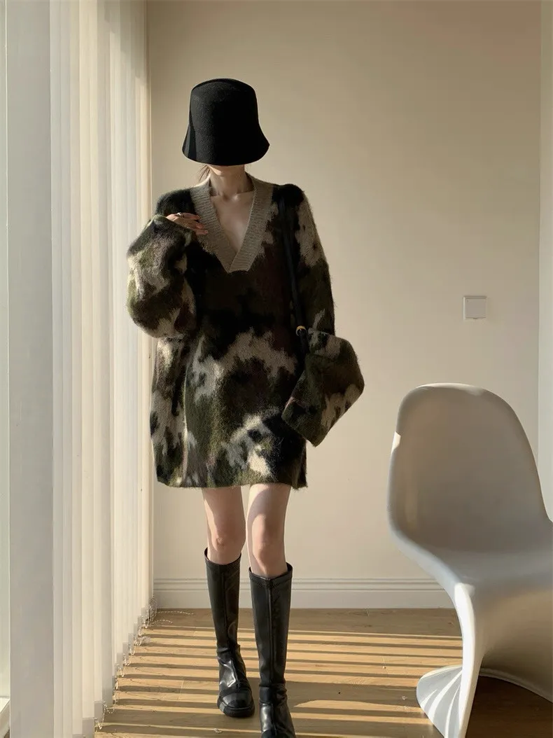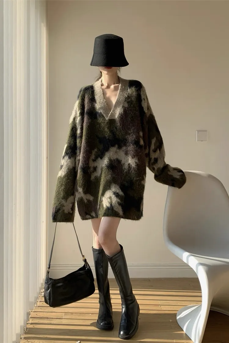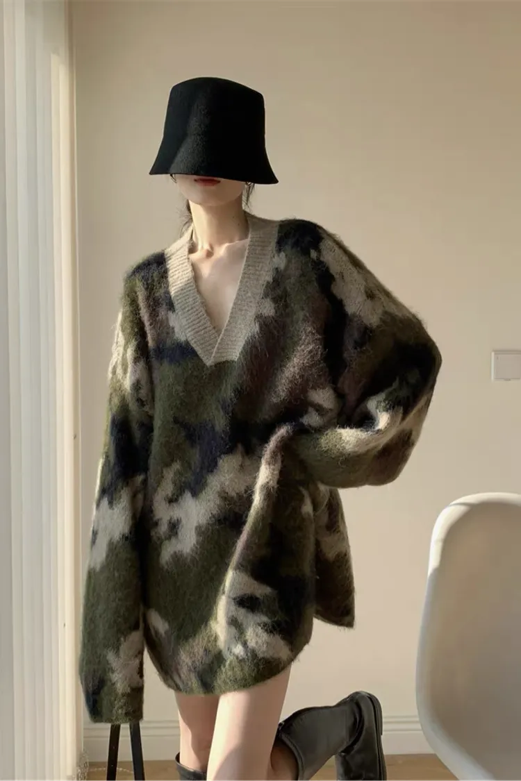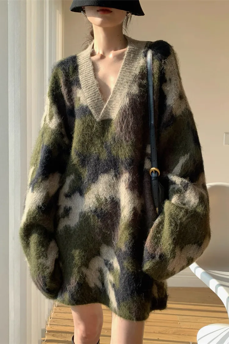 迷彩V領針織洋