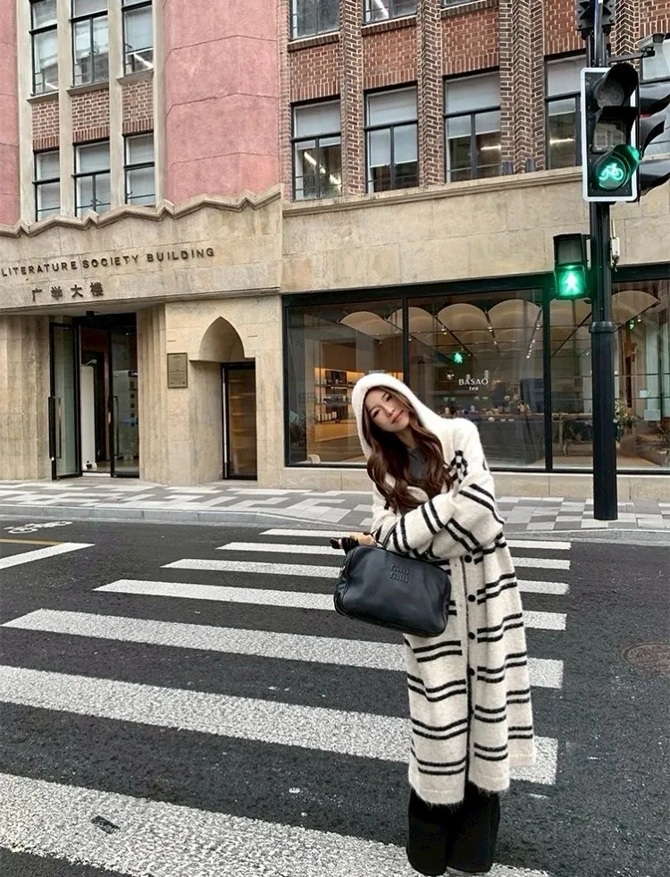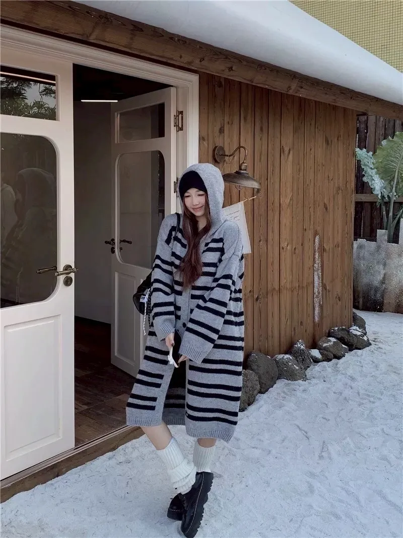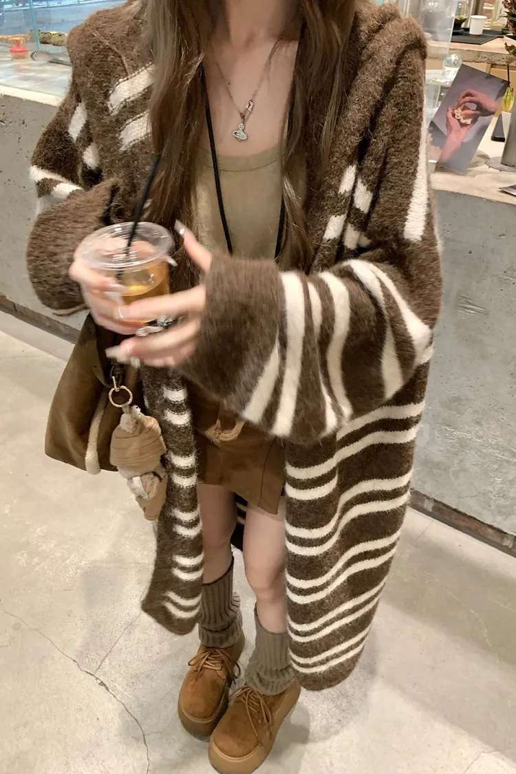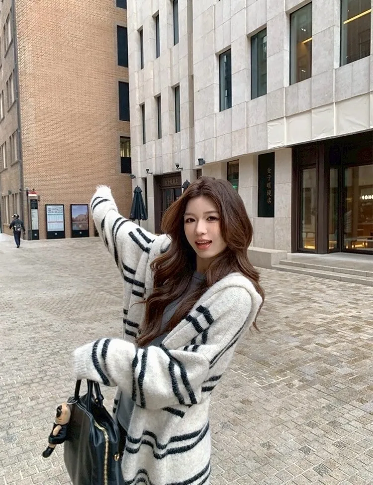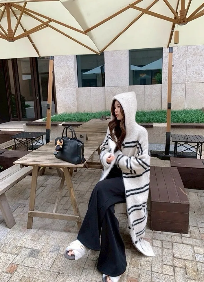 慵懶風連帽條紋針織外