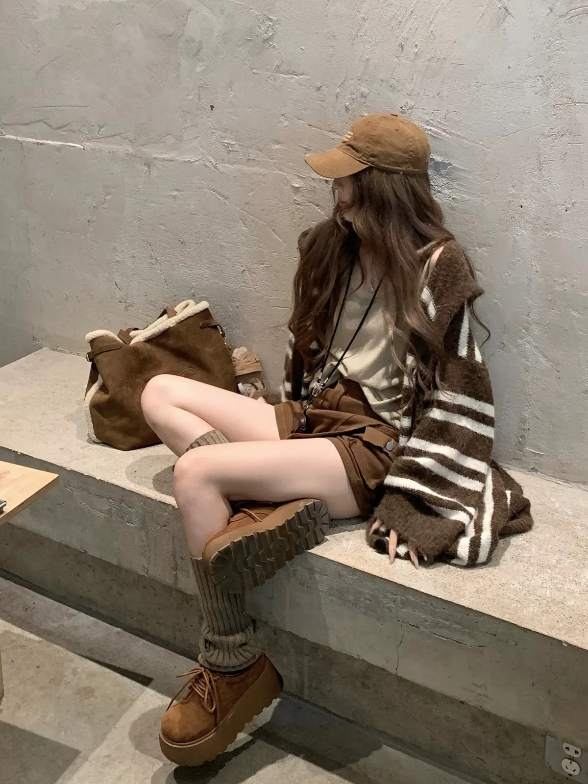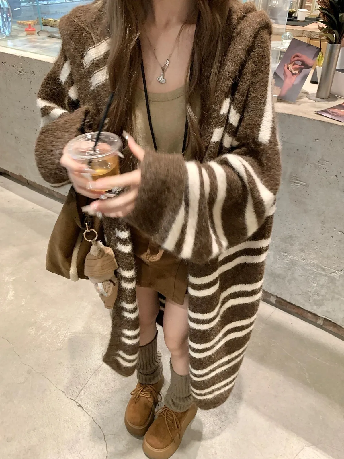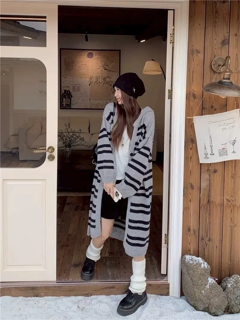 慵懶風連帽條紋針織外