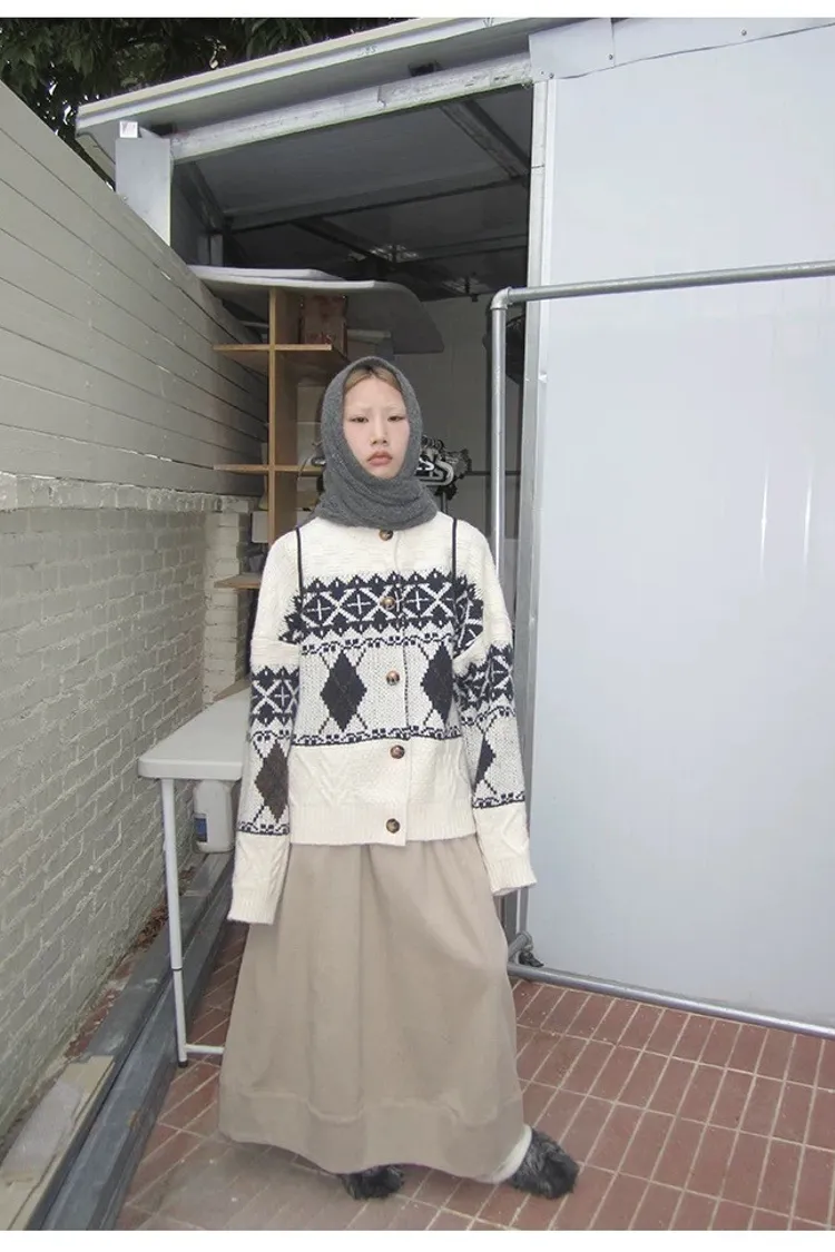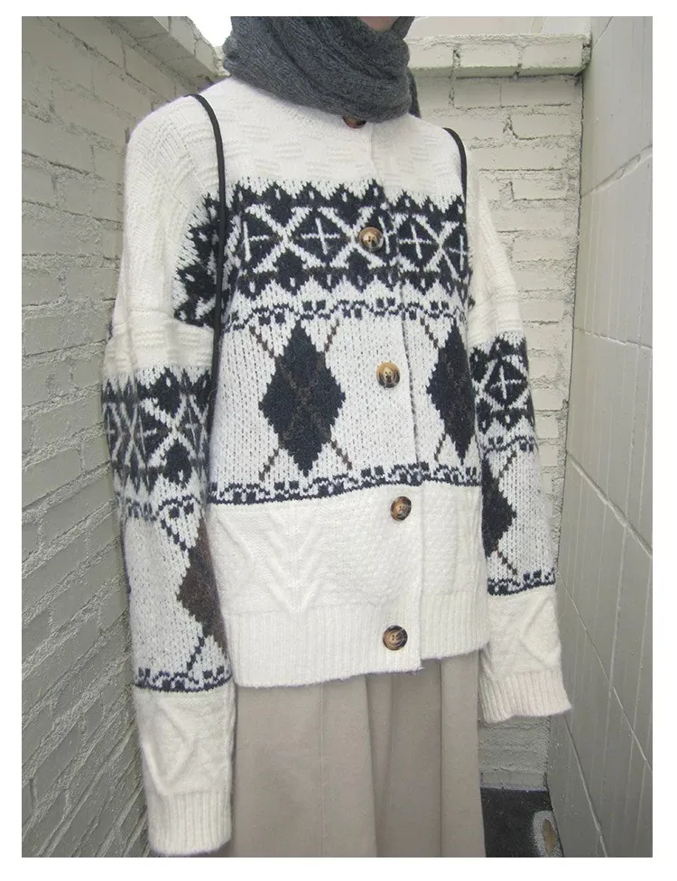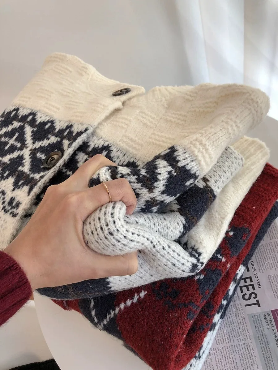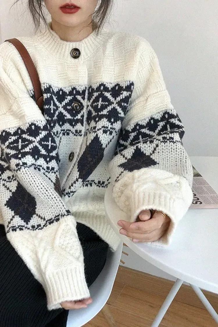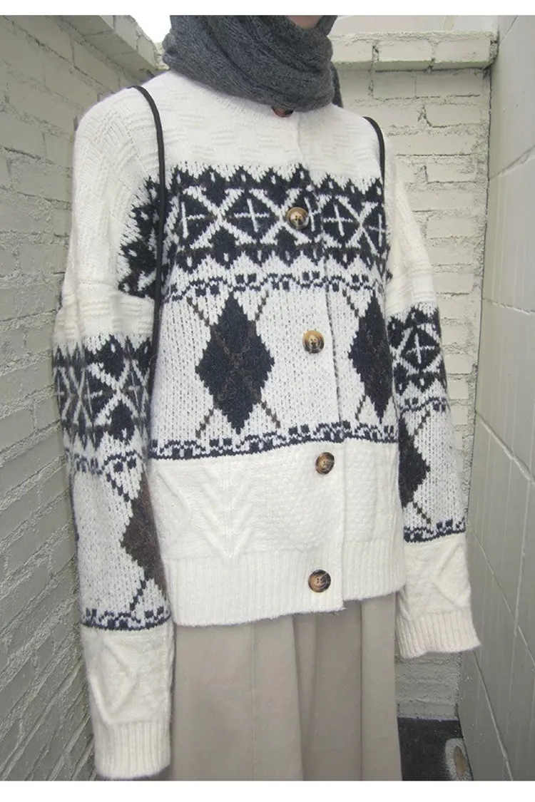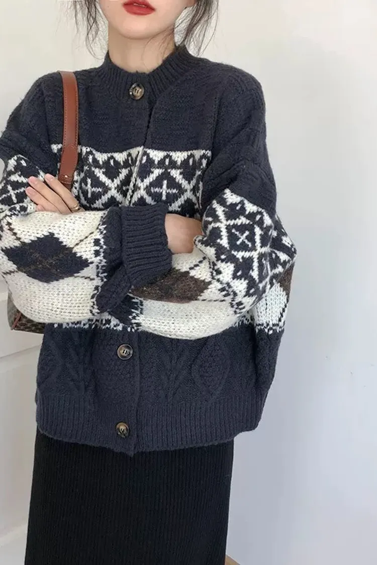 菱格紋開釦毛衣