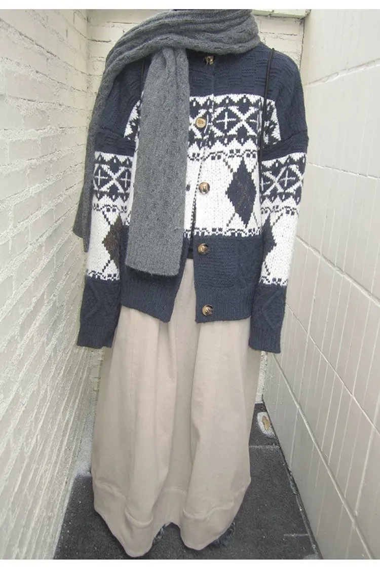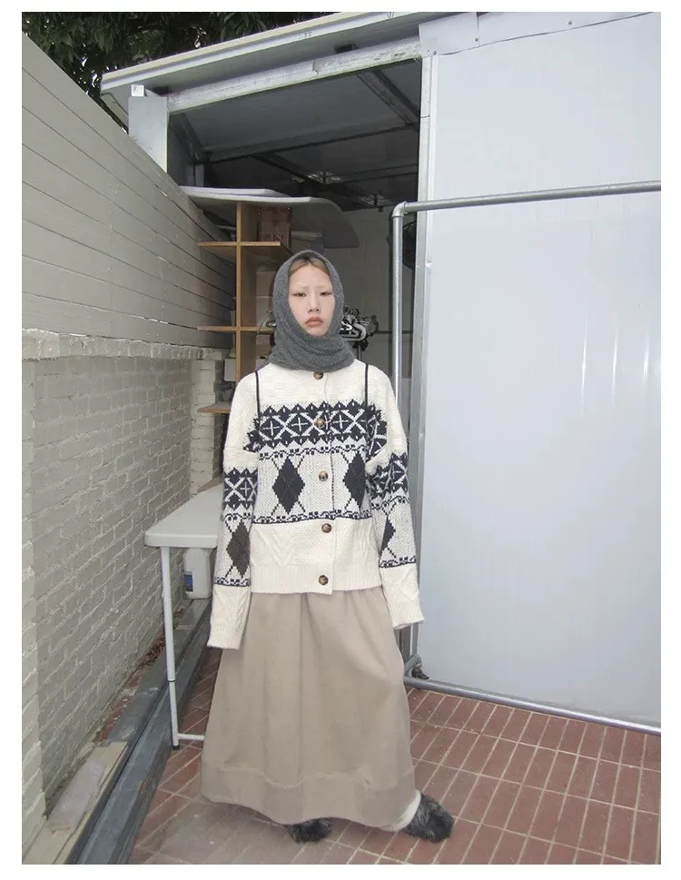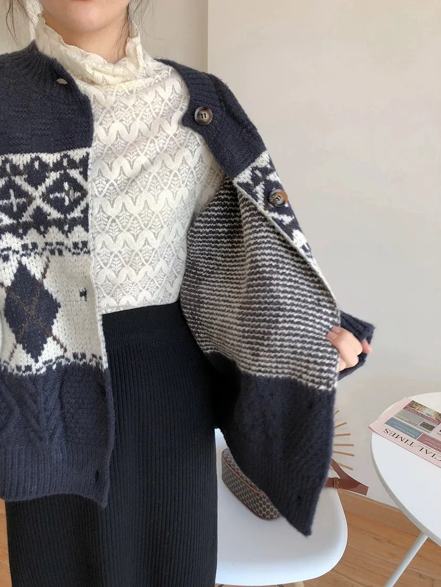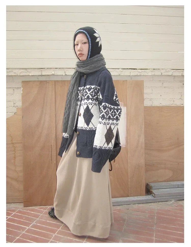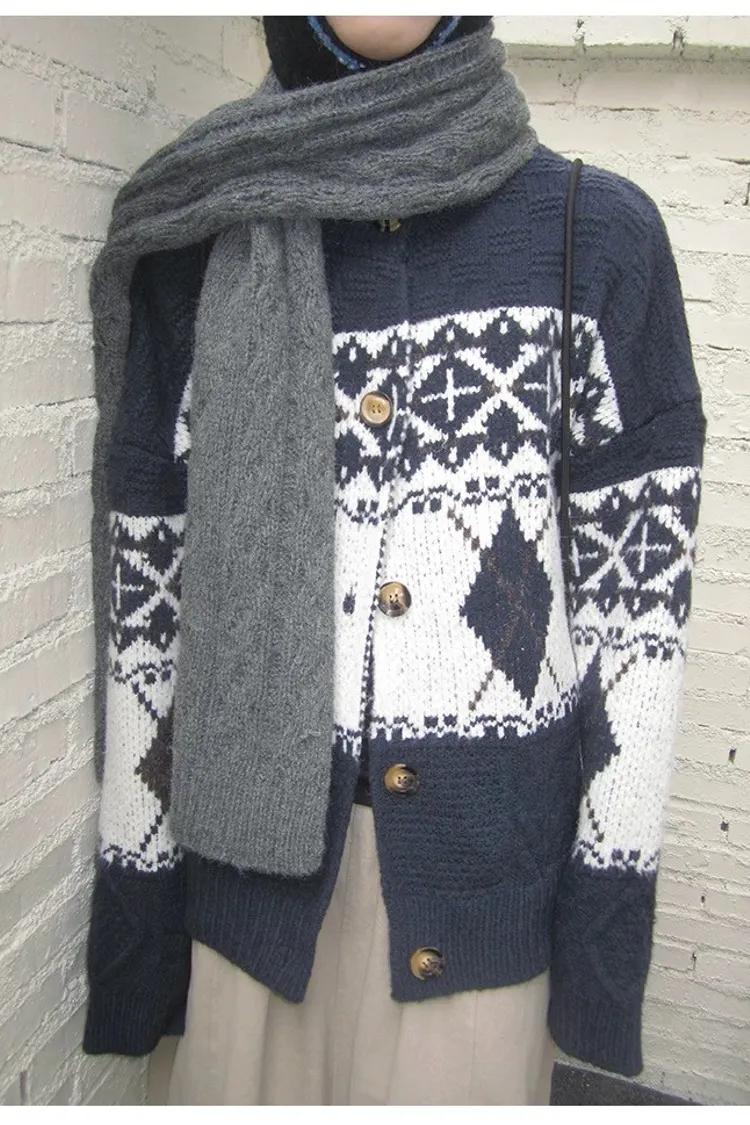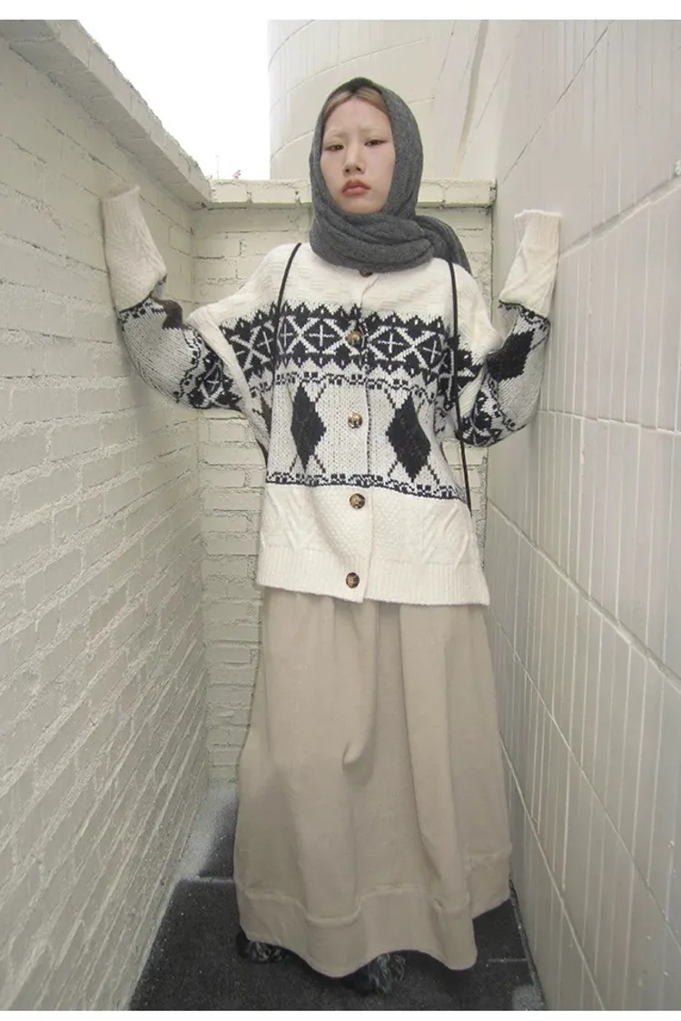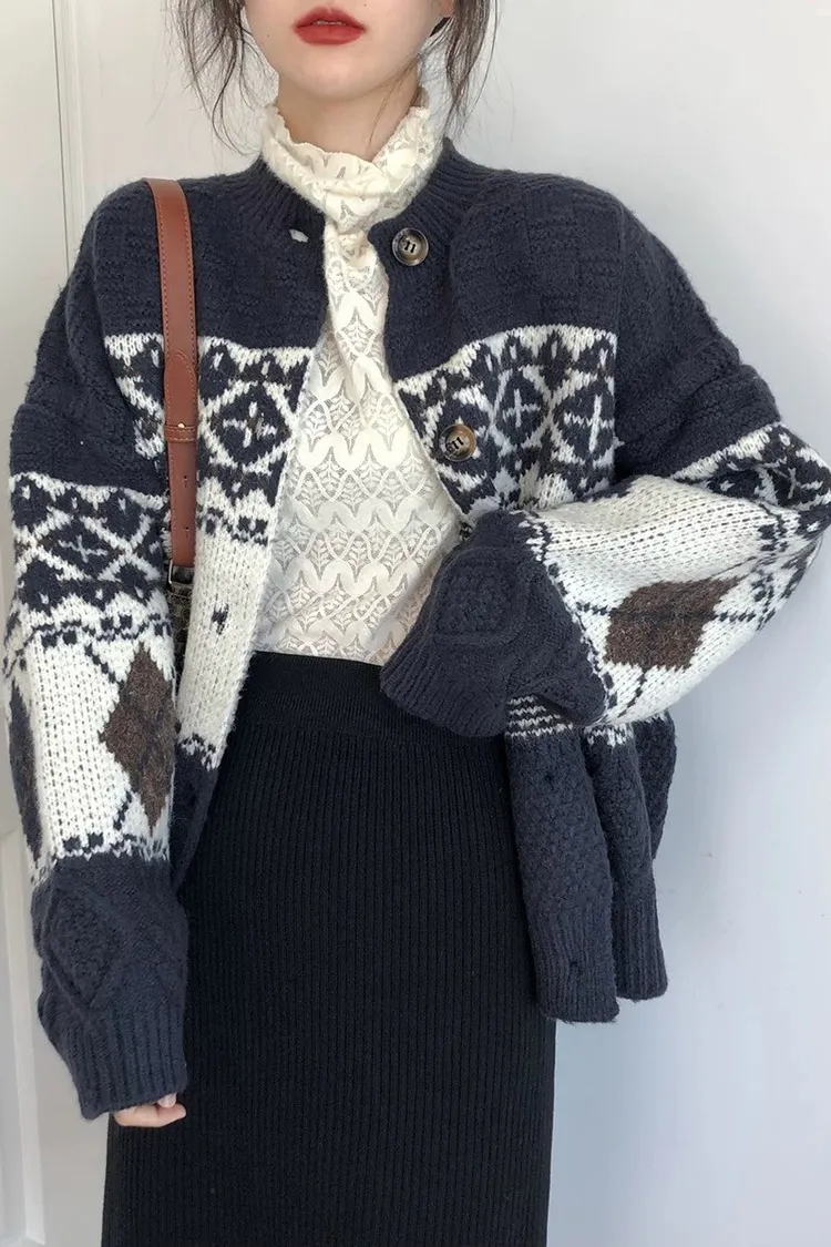 菱格紋開釦毛衣