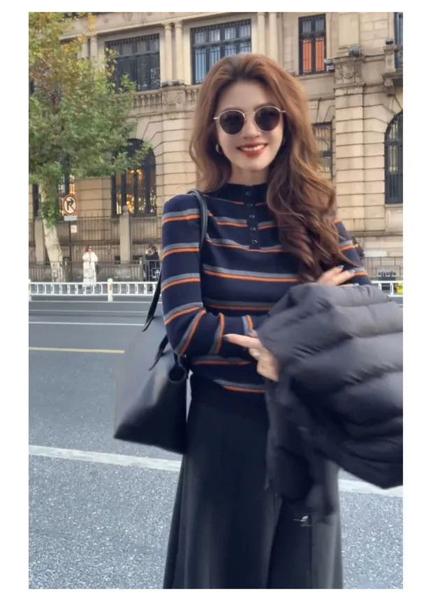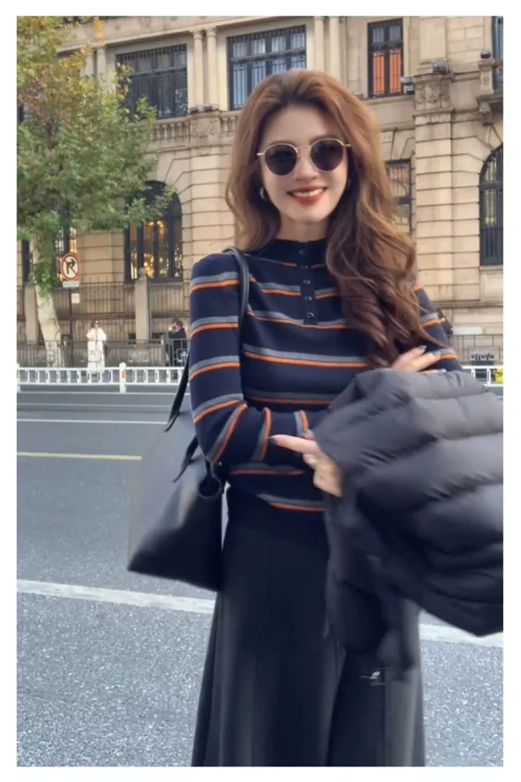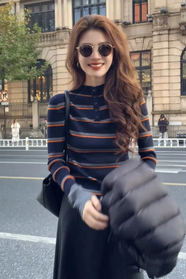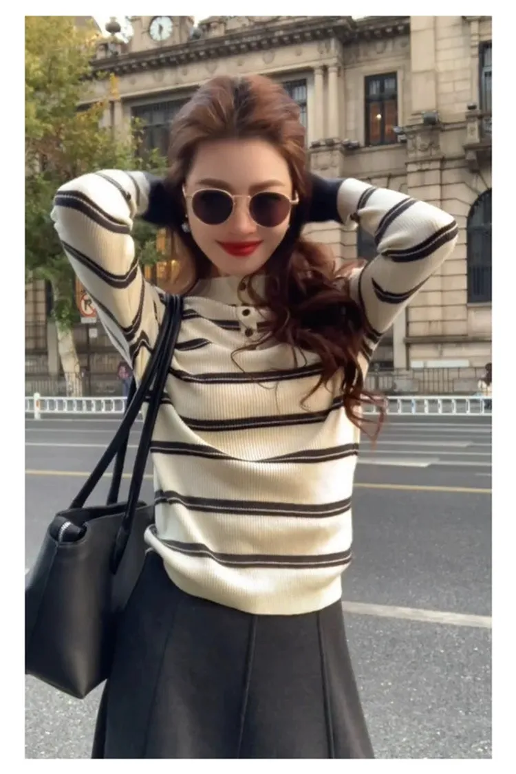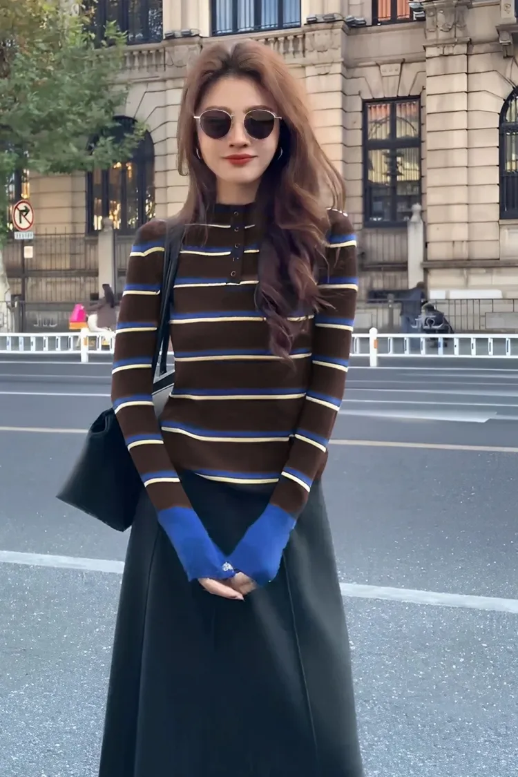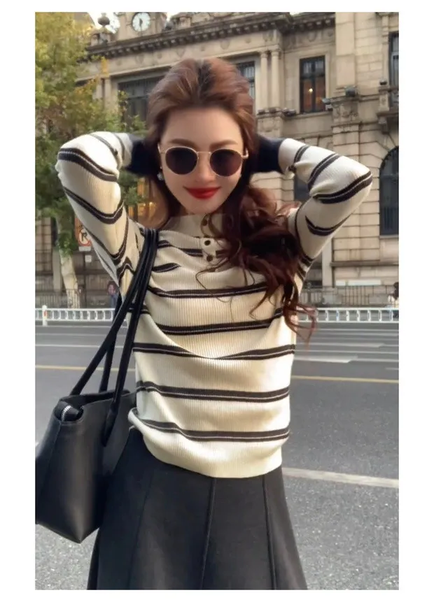 撞色袖半高領橫條上衣