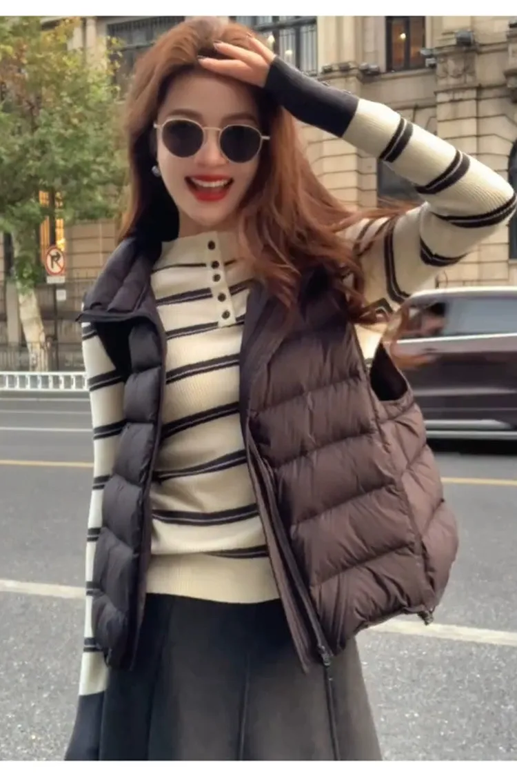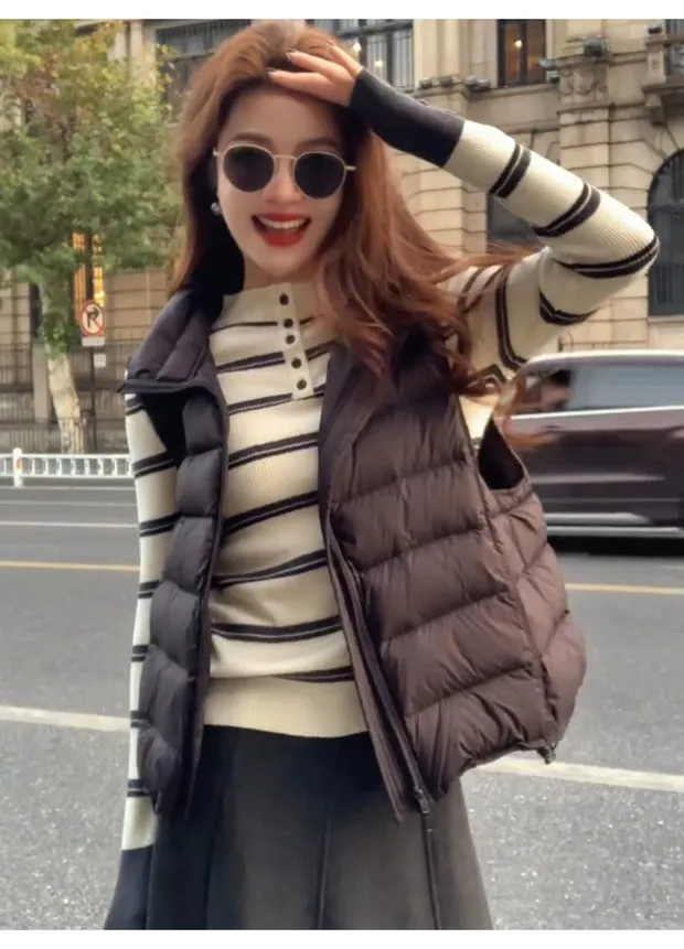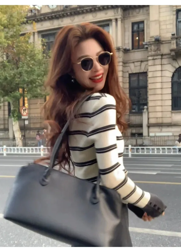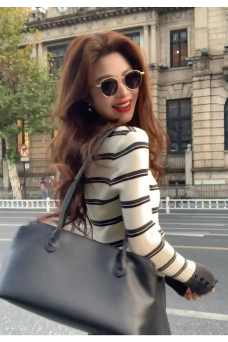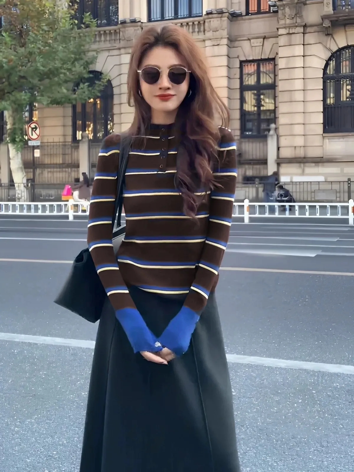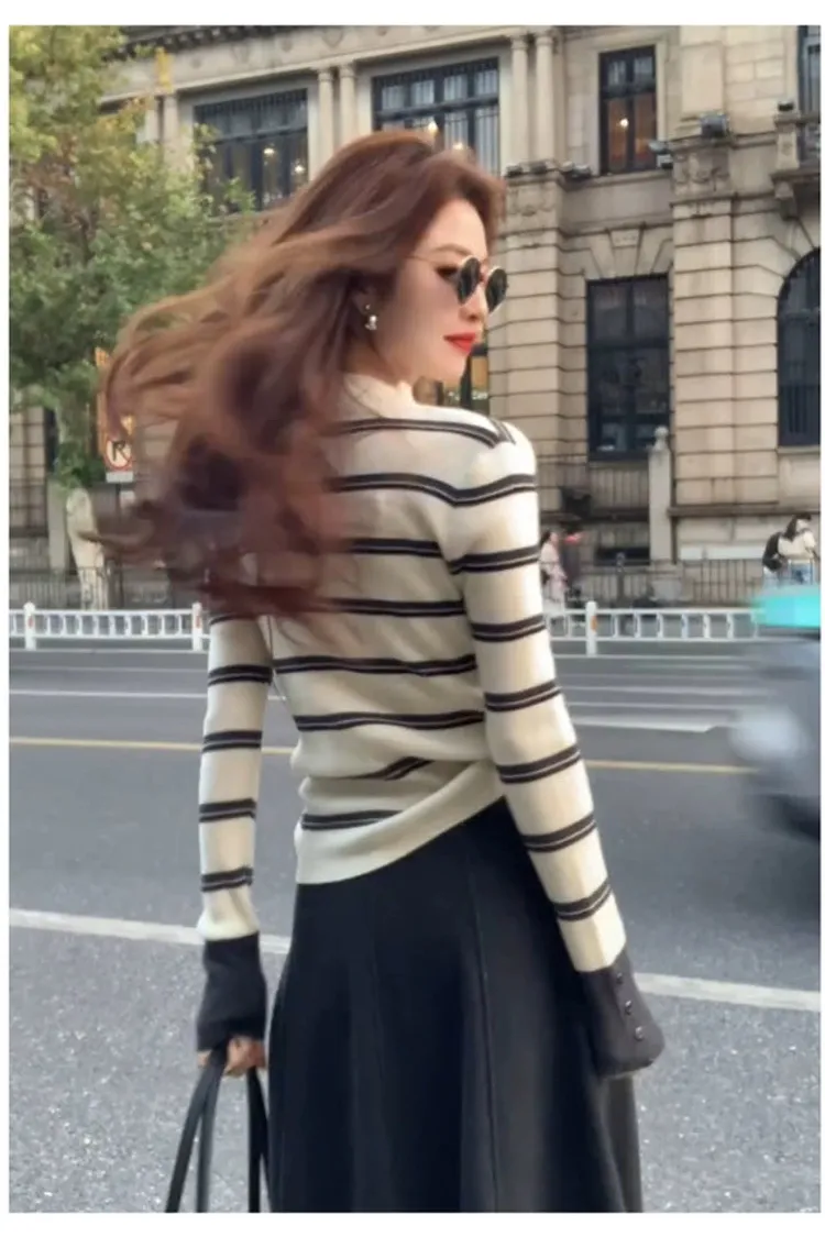 撞色袖半高領橫條上衣