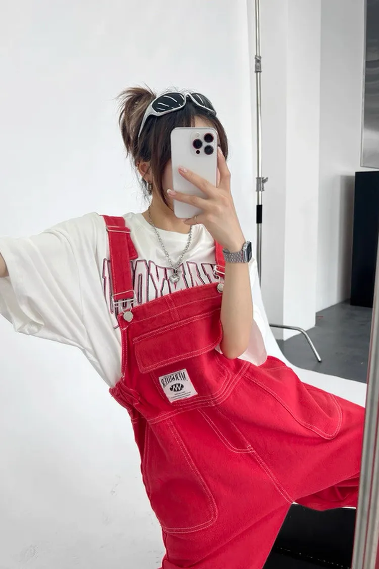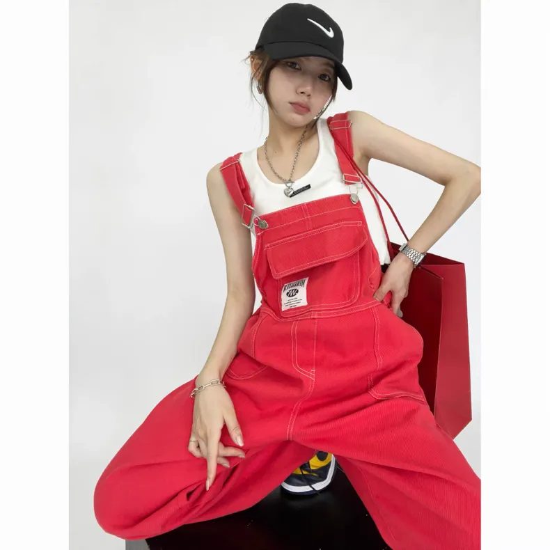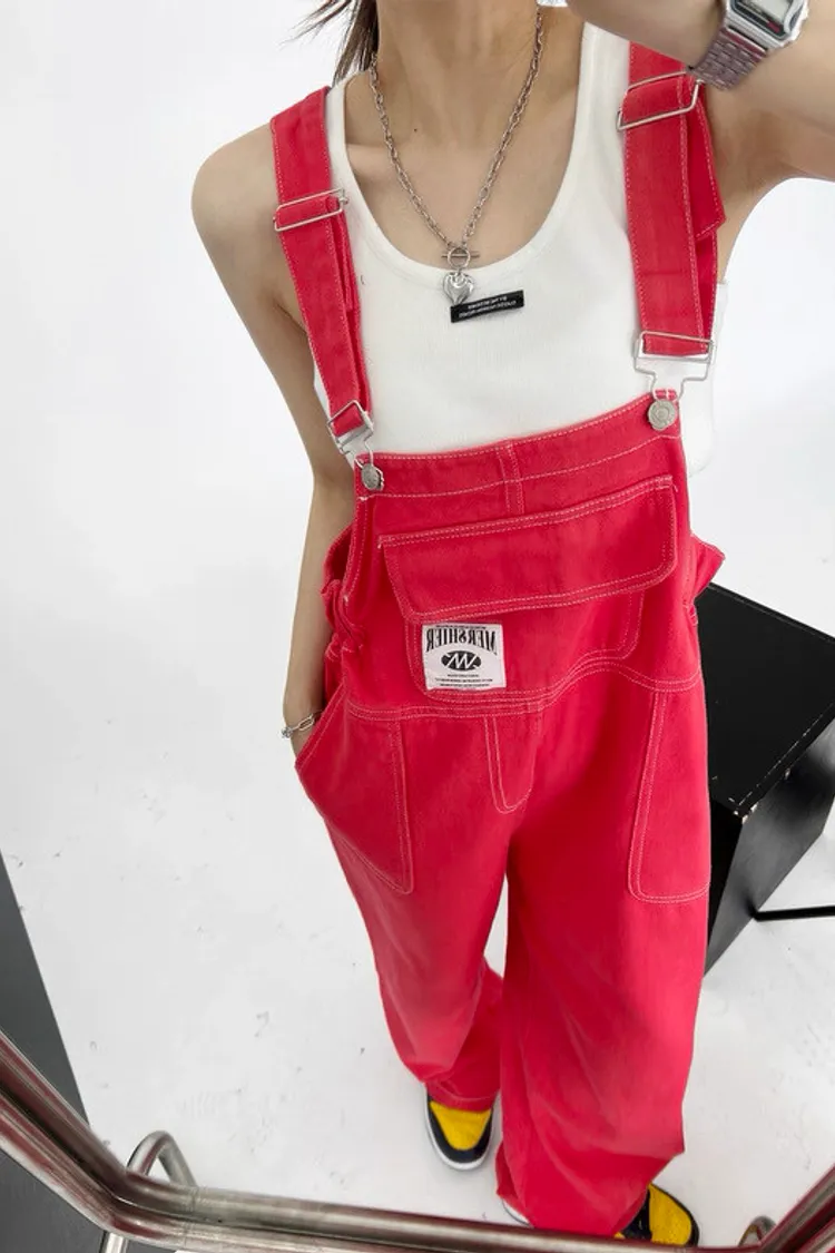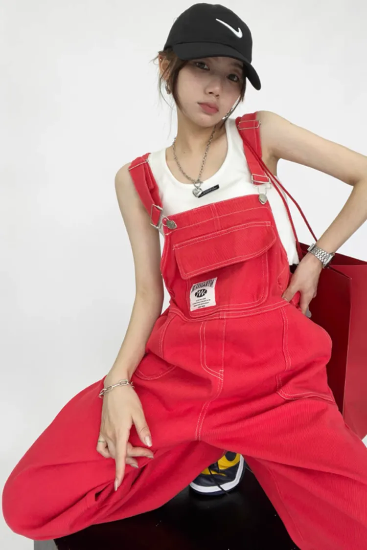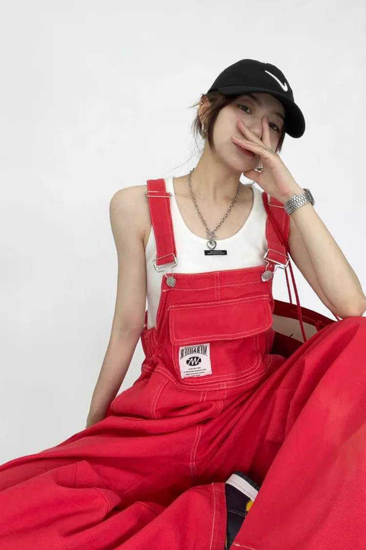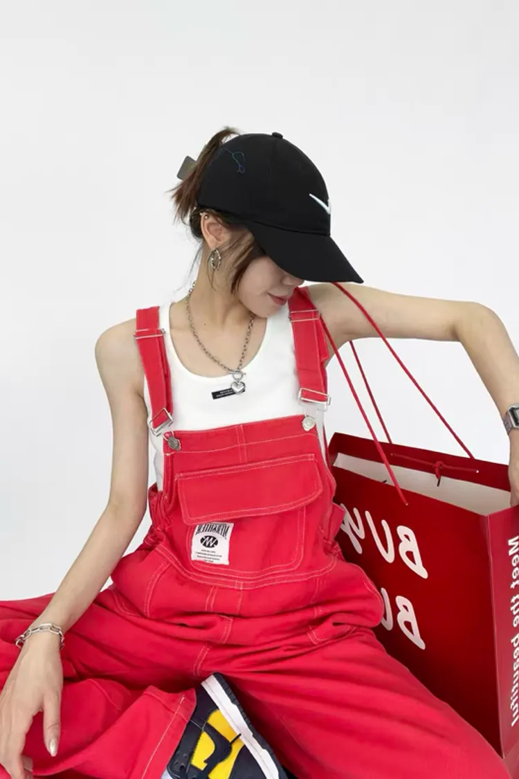 紅色縮腰吊帶褲