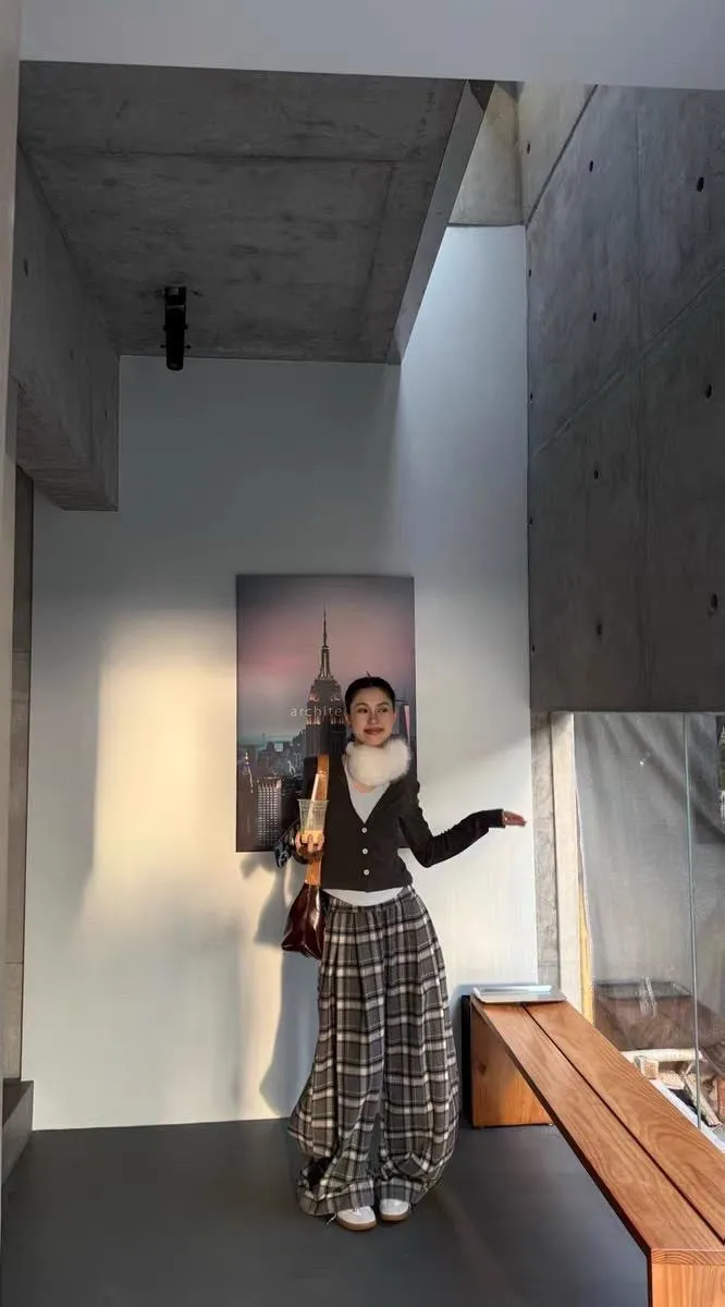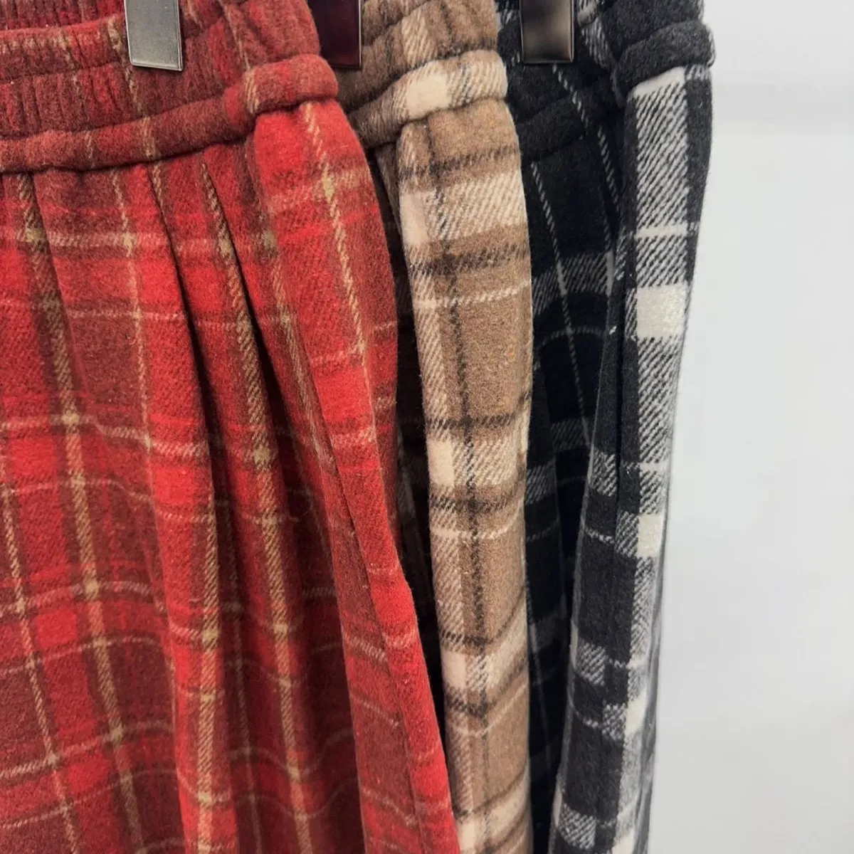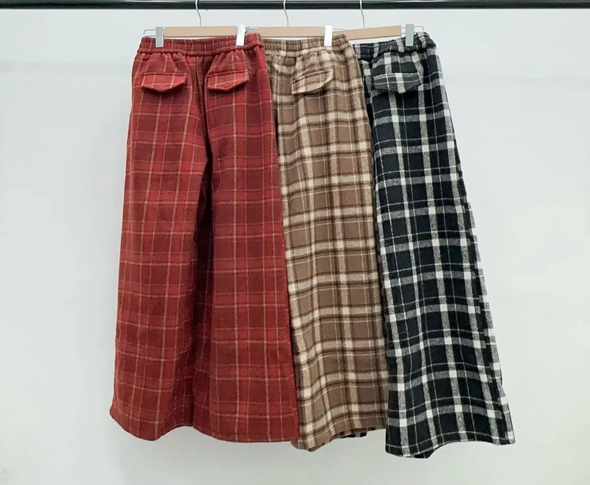 後假袋內刷毛格紋毛尼寬褲