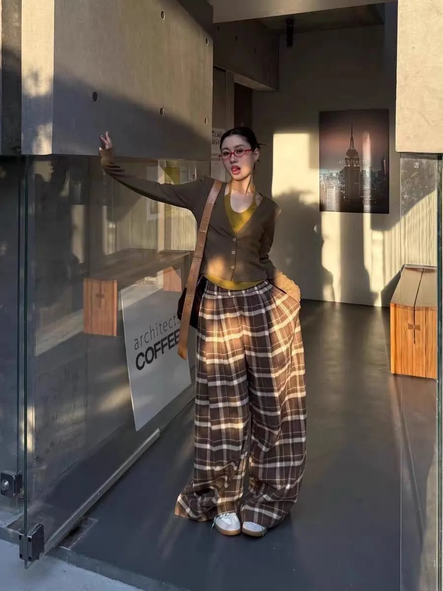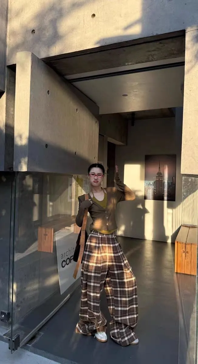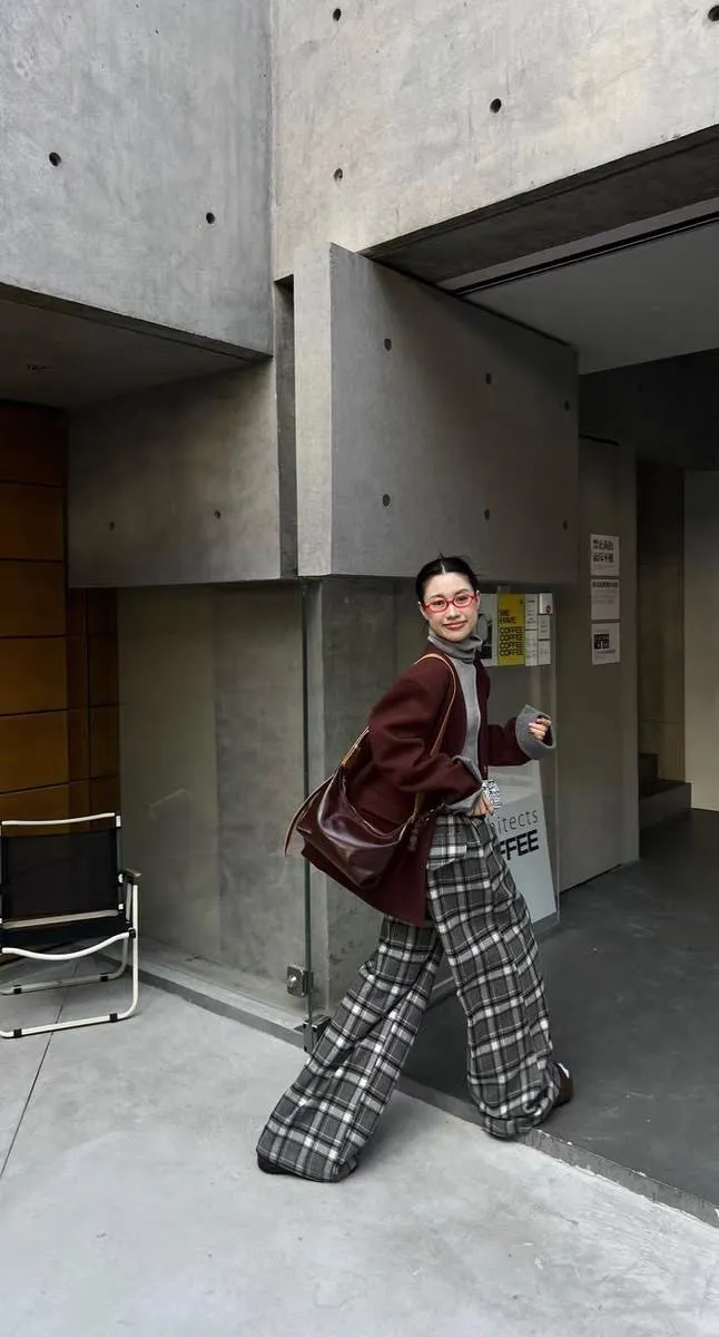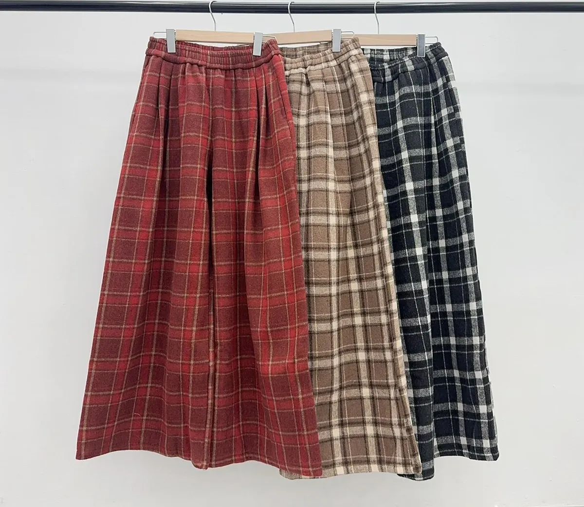 後假袋內刷毛格紋毛尼寬褲